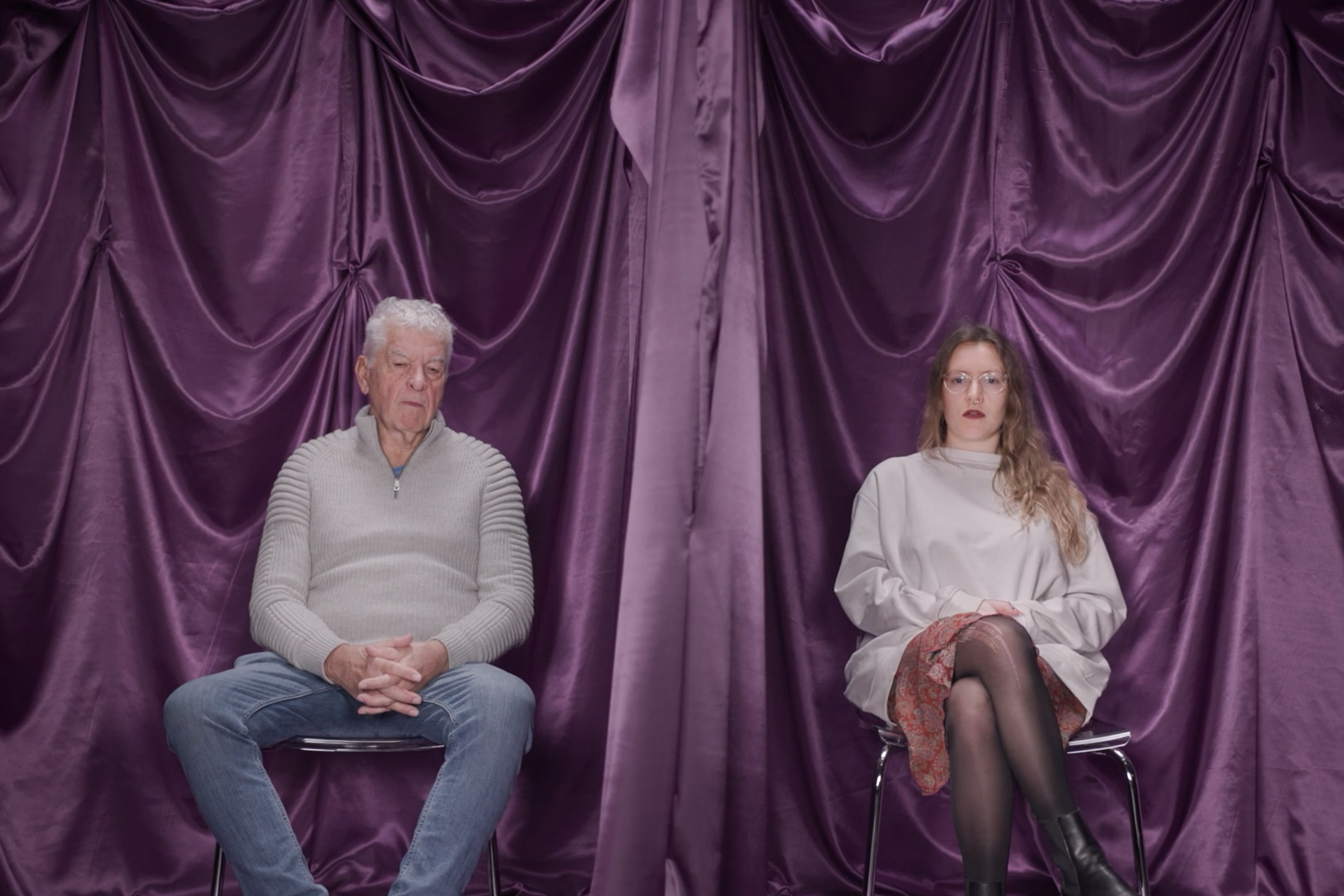 In an abstract love confessional, an older and a younger person aged between 20 and 82 meet in pairs for a documentary social experiment to deal with the really big issues: Love and Sexuality. Separated from each other only by a partition with a lattice window, the generations explore online dating, sexual orientations, different relationship models, feminist dating, and toxic behaviors. The purple satin love confessional as an ambiguous quotation and stylistic device simultaneously creates a basis for approaching the question at eye level: How much connects, how much separates the generations?